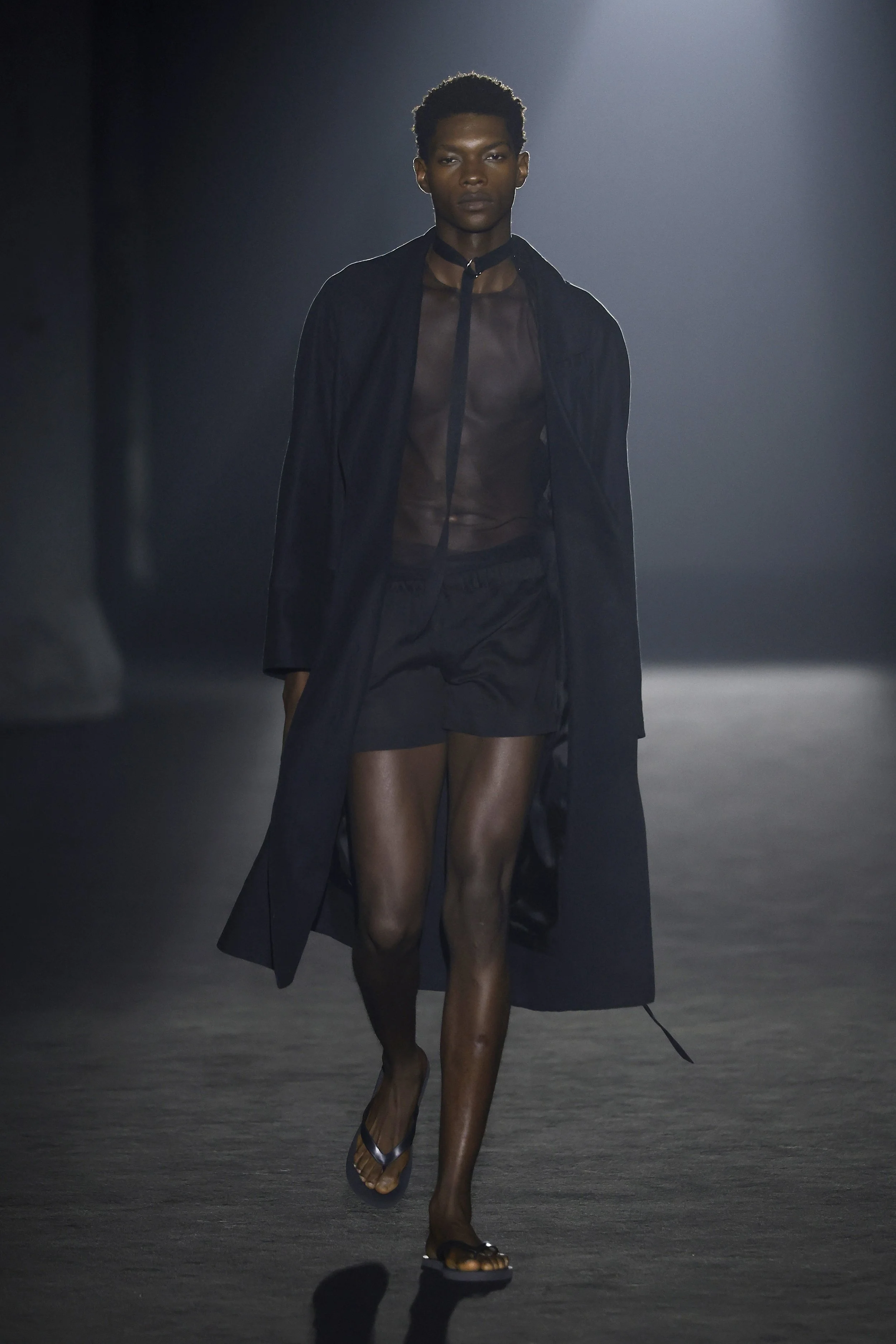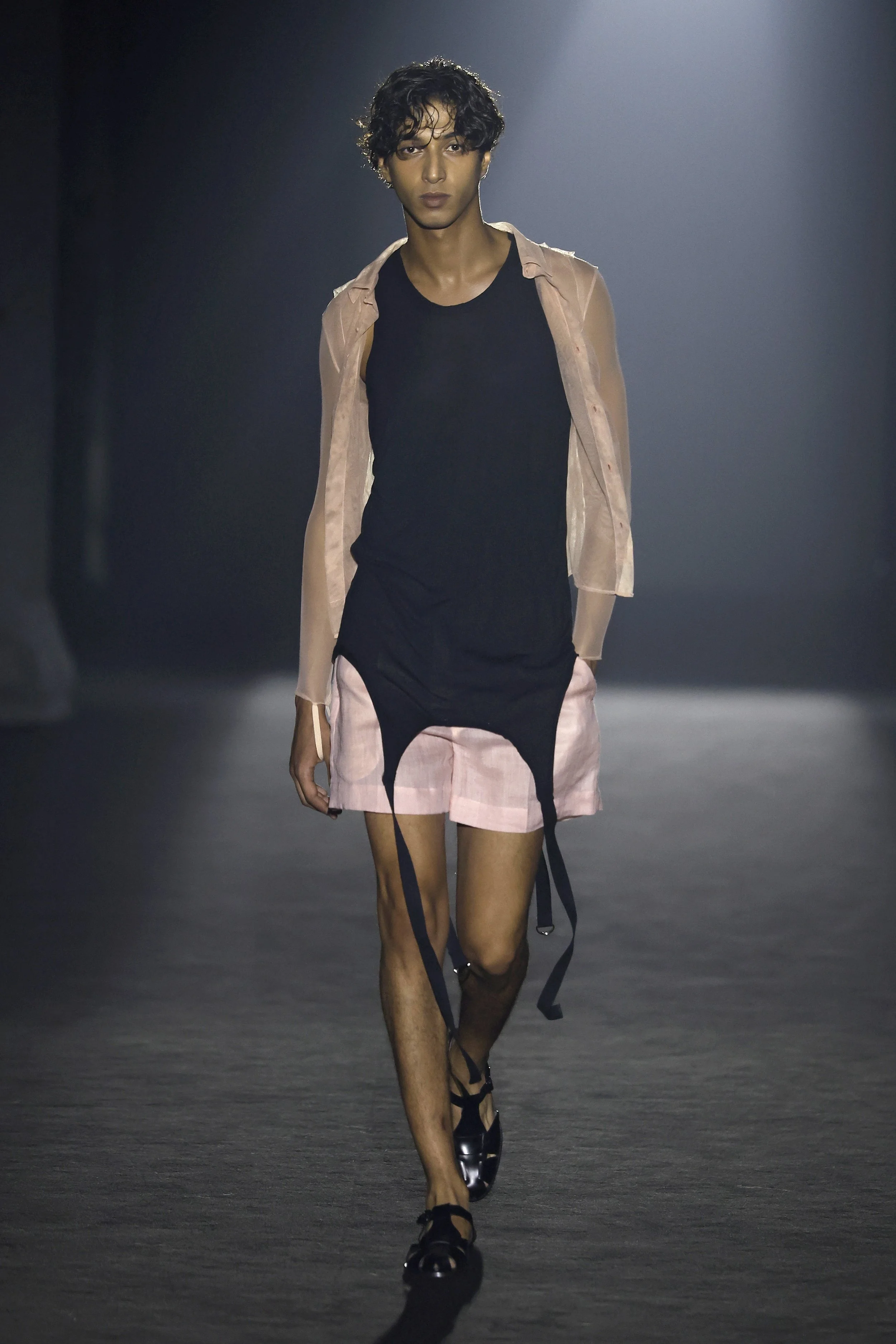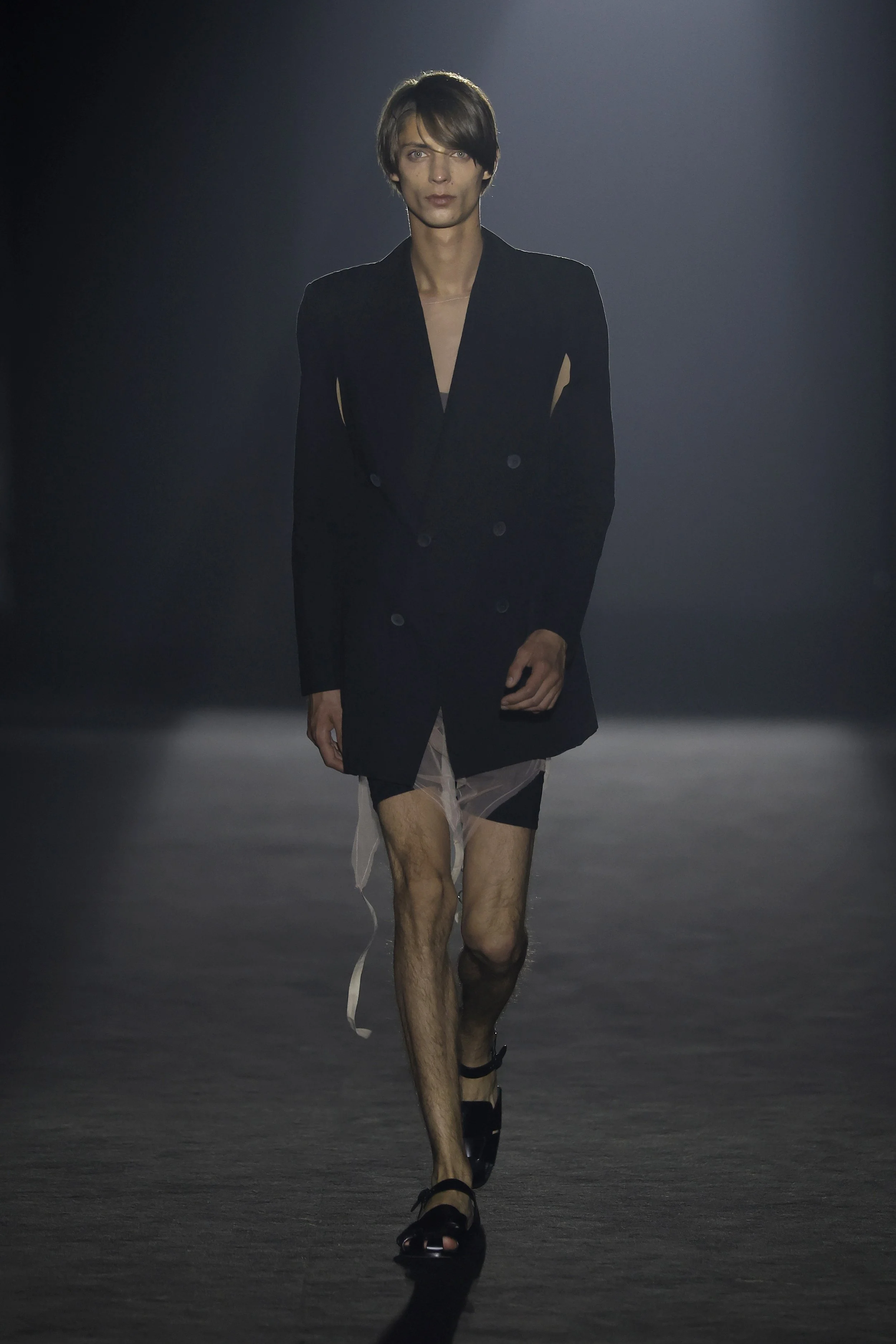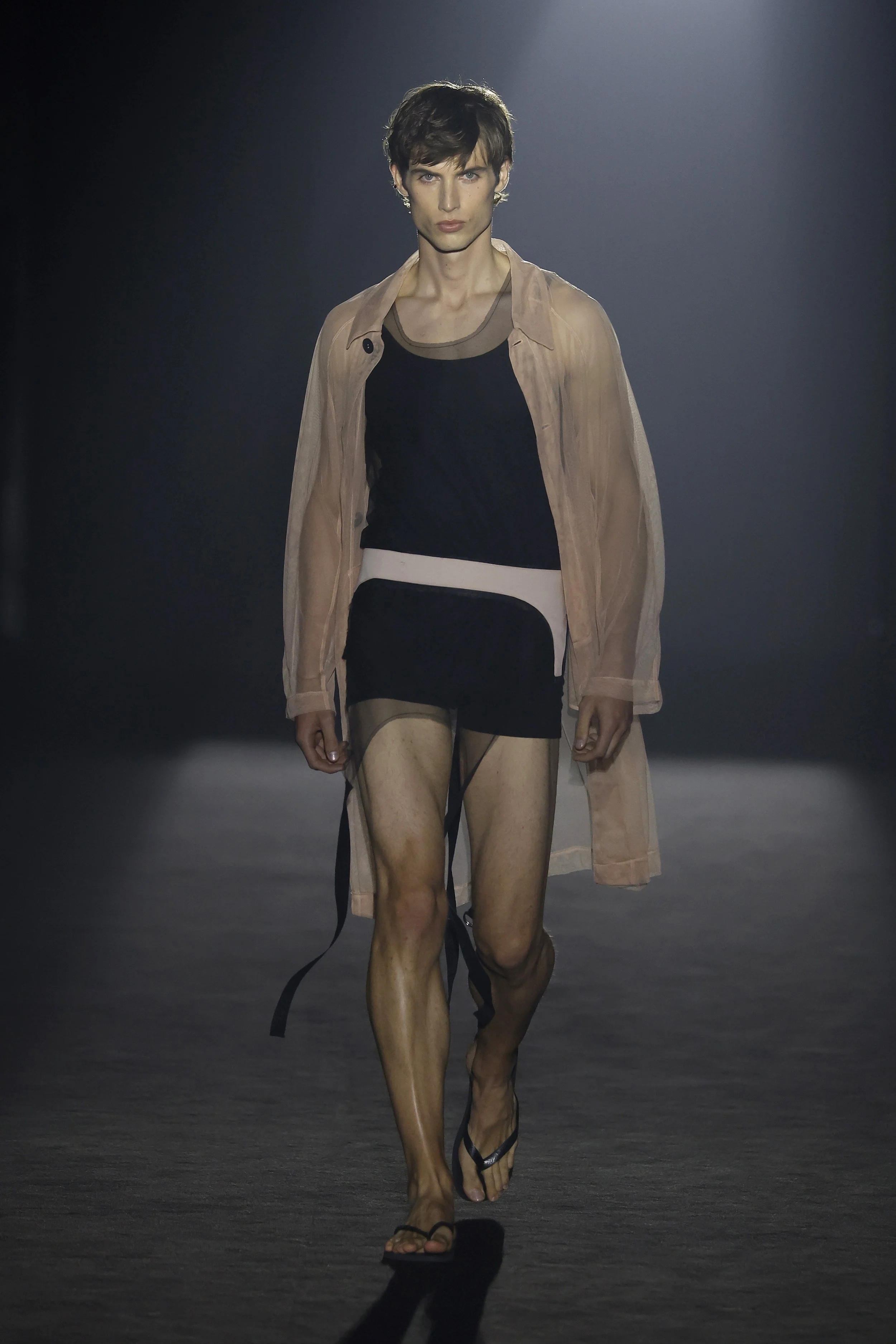 Traditional codes of menswear are disrupted through details borrowed from lingerie — sheer layers, exposed linings, adjustable straps, fastenings brought to the surface. Pin tucks trace the path of stockings; tapes hang like echoes of garters; tuxedo straps recall corset closures. The invisible becomes surface; the functional becomes gesture. Intimacy becomes construction.