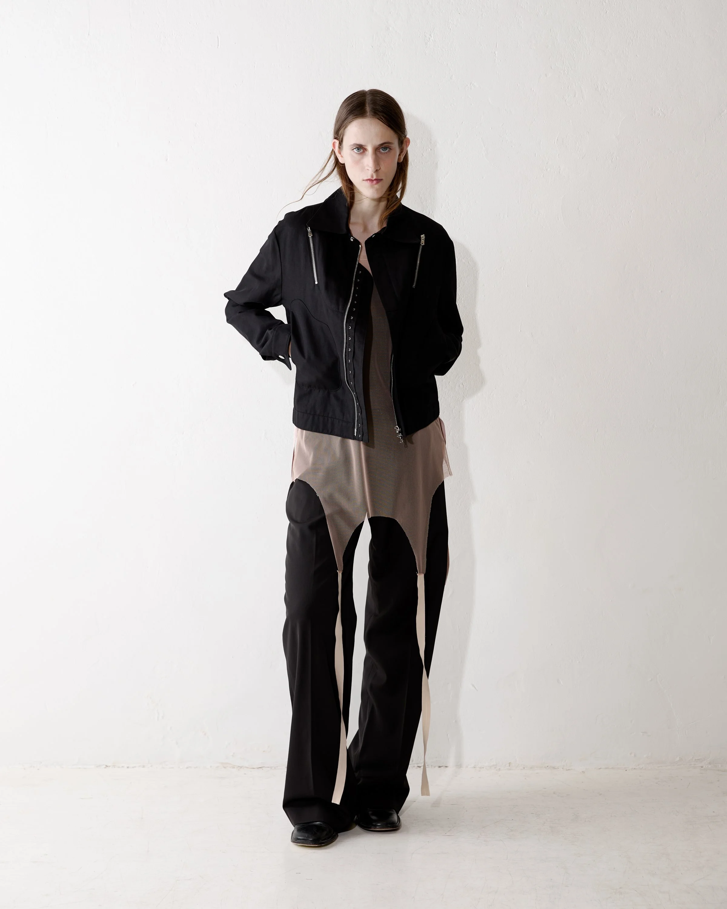 Black cotton biker jacket, cut to a streamlined silhouette. Double end zip closure at front with an additional hook tape. Loose nude-pink belt with D-rings inside the garment. Press-stud fastening at collar and cuffs. Two pockets with zip closure on the chest . Regular fit.